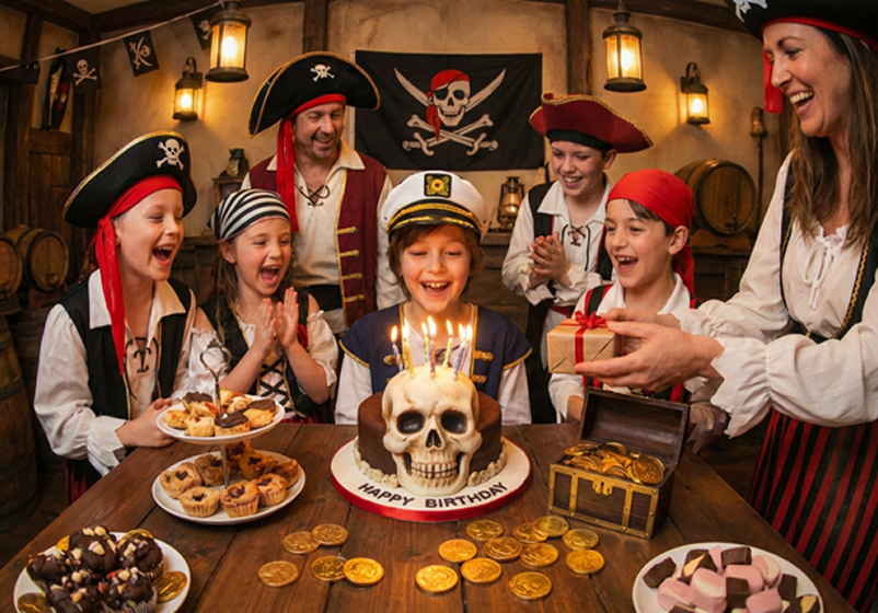 Après l’aventure, vos jeunes flibustiers pourront souffler les bougies dans la taverne, puis rejoindre un espace réservé pour un goûter que vous personnaliserez avec notre équipage.